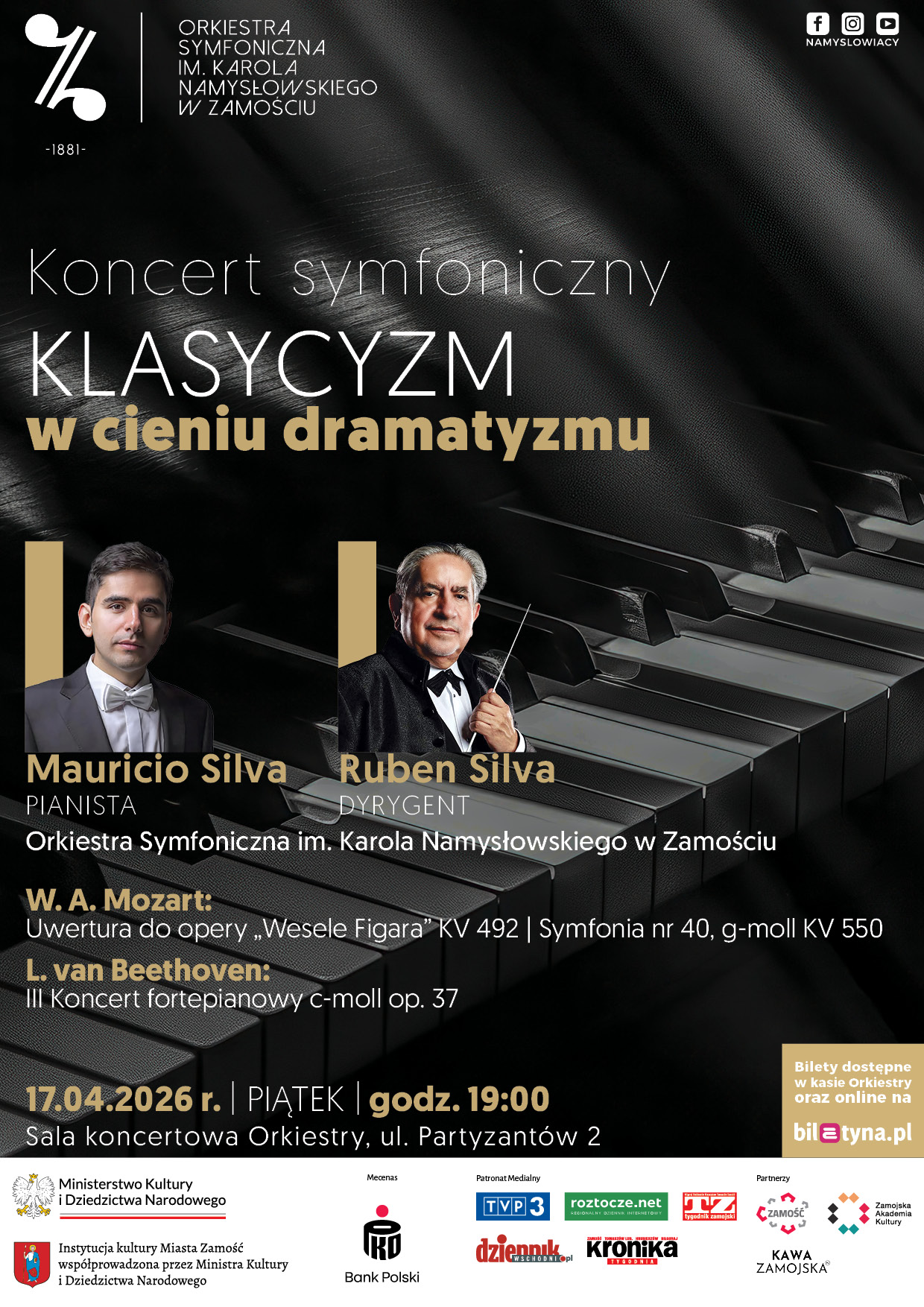 To wieczór, w którym elegancja klasycyzmu spotyka się z napięciem, kontrastem i emocjonalną głębią. Na naszej scenie wystąpi wybitny pianista Mauricio Silva, a Orkiestrę Symfoniczną im. Karola Namysłowskiego w Zamościu poprowadzi Ruben Silva.
