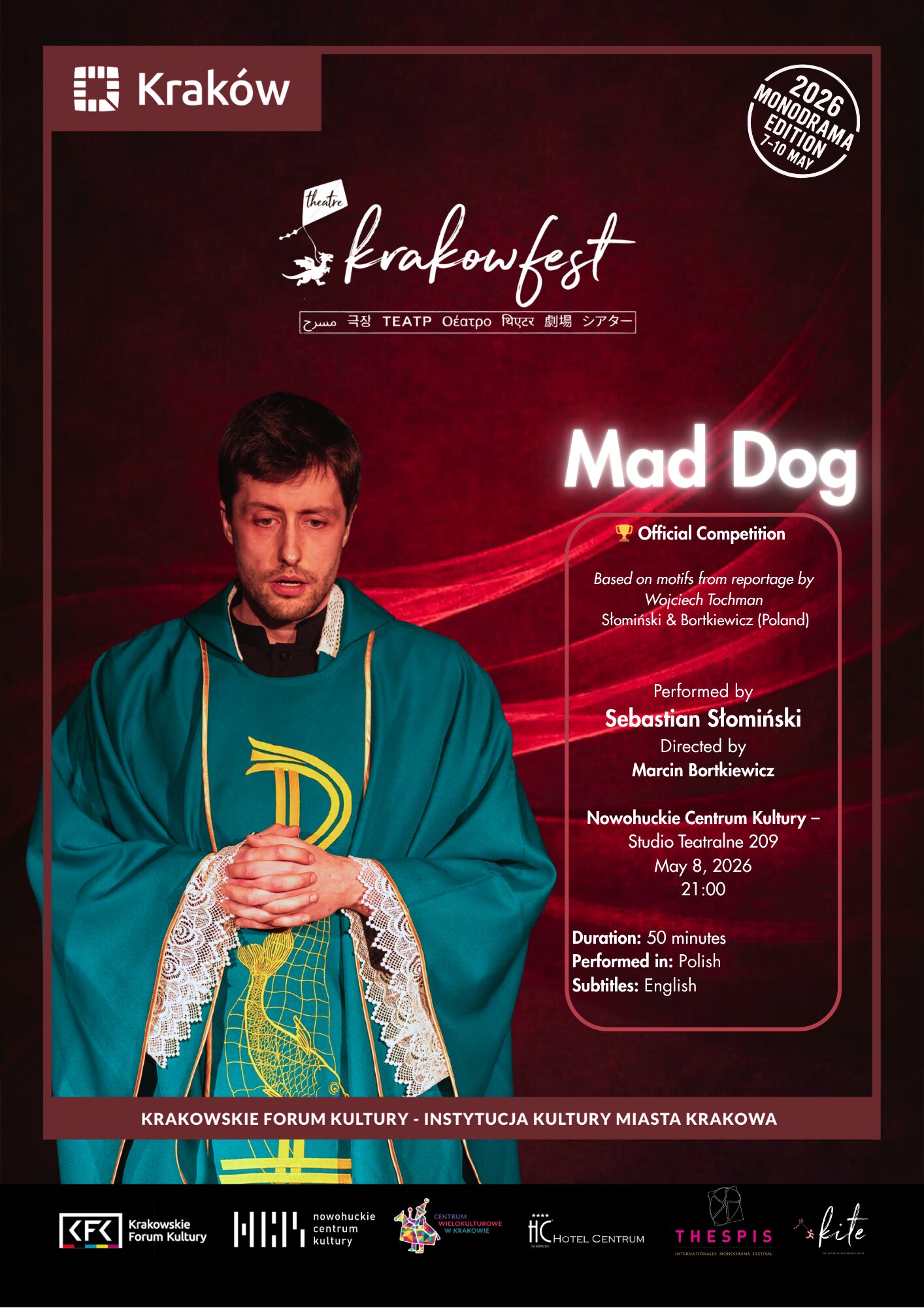 Mad Dog is a monodrama based on the reportage of Wojciech Tochman, structured as a priest’s homily addressed directly to the audience. The spectators become witnesses to the confession of a man struggling with his identity, addiction, and illness, as he confronts his past and seeks understanding.